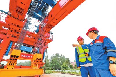本报讯(记者宋敏/文聂冬晗/图)8月5日10时18分,郑州航空港区郑州机场至许昌市域铁路(以下简称“郑许市域铁路”)施工现场,施工人员操纵着架桥机,将一孔重562吨的预制箱梁,架设在高架段0号桥台上。这标志着郑许市域铁路高架区间成功架设首孔箱梁,正式进入线上施工阶段。
