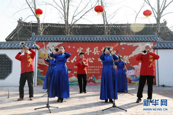 12月27日,民间艺人在河南省平顶山市宝丰县张八桥镇姚店铺村表演唢呐演奏。