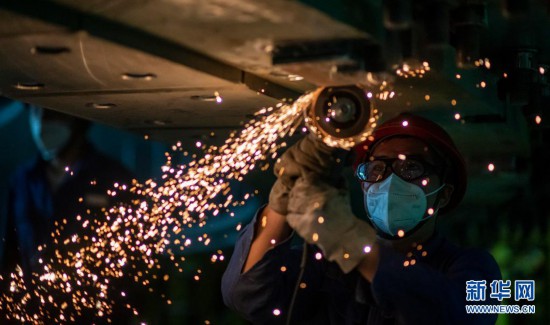 工人在进行打磨转子切向键作业(5月14日摄)。新华社记者 江文耀 摄