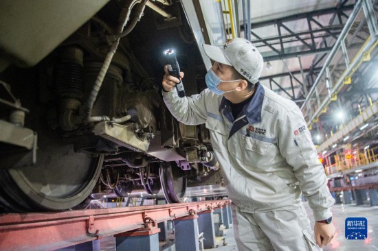 武汉动车段的地勤机械师在对动车进行车下部件检查(2月1日摄)。