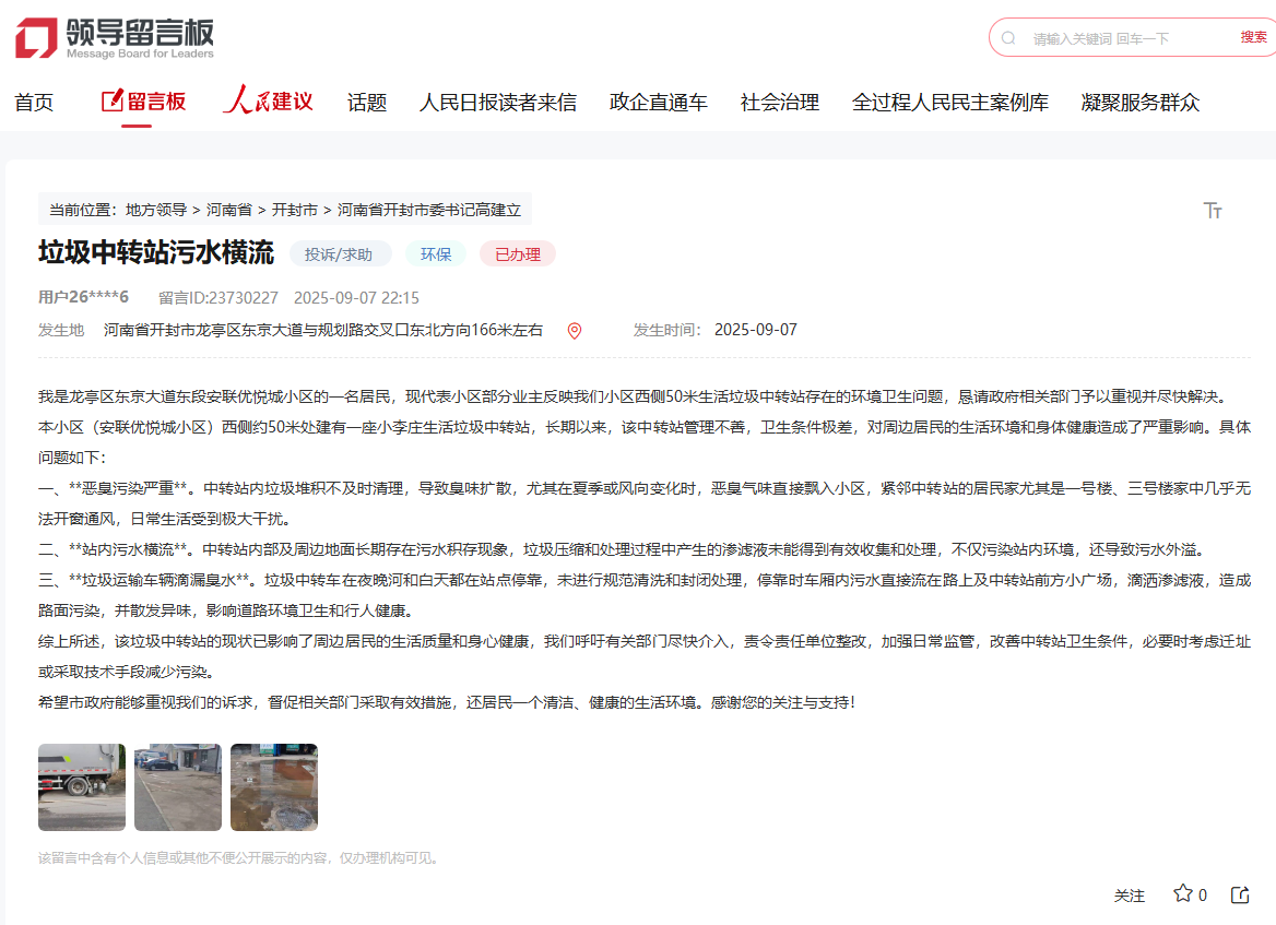 这位居民详细列举了三大问题:中转站内垃圾堆积不及时清理,导致臭味扩散,尤其在夏季,紧邻中转站的居民家中几乎无法开窗通风;站内及周边地面长期存在污水积存现象,渗滤液未能得到有效收集和处理;垃圾运输车辆停靠时车厢内污水直接流在路上,滴洒渗滤液,造成路面污染。