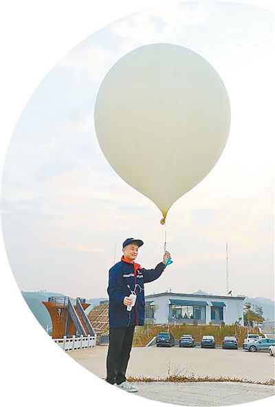 广东河源国家高空气象观测站,观测员施放北斗导航智能探空气球。