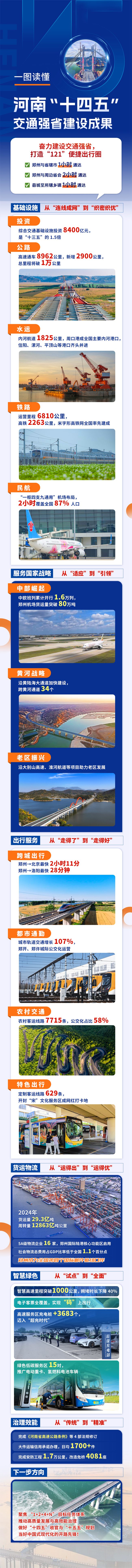 “郑州与省辖市1小时通达、郑州与周边省会城市2小时通达、县城至所辖乡镇1小时通达,全省‘121’便捷出行格局基本形成。”河南省交通运输厅党组书记、厅长付磊介绍,“十四五”期间,河南综合交通基础设施投资将达8400亿元,是“十三五”的1.5倍,全省综合交通网总规模达29.2万公里。