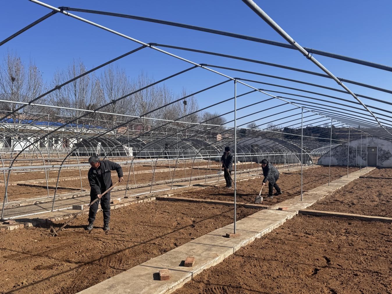 在朱阳镇育苗工场,一座座白色大棚整齐排列,在阳光下格外醒目。工人们分工协作:有人站在棚顶用铁丝加固钢架,防范大风;有人蹲在棚边铺设新膜、压牢边际;有人手持工具修整苗床,平整后覆盖细砂土。现场繁忙而有序。