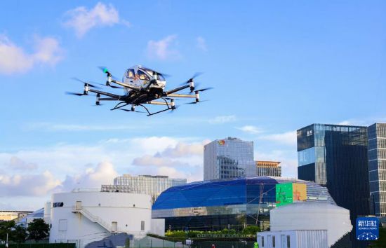 在2025国际低空经济博览会期间,亿航智能的无人驾驶载人eVTOL(电动垂直起降飞行器)在上海飞行(2025年7月23日摄)。新华社发