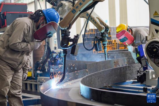 在四川眉山天府新区中建钢构四川有限公司加工车间里,机器人操作员在观察机器人焊接钢构产品的焊接点(2026年3月23日摄)。新华社发(翁光建摄)