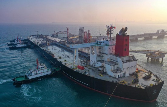 2025年12月18日,一艘装载着17.9万吨石化原辅料的船舶泊入国投洋浦油储码头30万吨级原油泊位(无人机照片)。新华社记者 郭程 摄